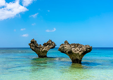 2つの大きな岩がハート型に見える「ハートロック」は、沖縄の美しい自然が作り出した絶景スポットです。夕暮れ時には幻想的な景色が広がり、昼間とはまた違った雰囲気に包まれます。フォトスポットとしても人気の観光名所です。